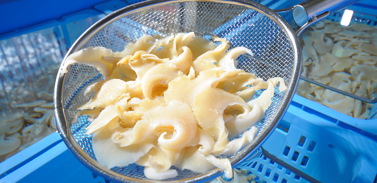 缶詰用にフカヒレを厳選。職人が一枚一枚丁寧に下処理し、コラーゲンを最大限に留める独自の製法でふっくら仕上げました。きめ細かい繊維のコリコリ食感は鮮度を生かした出来立ての味わい。