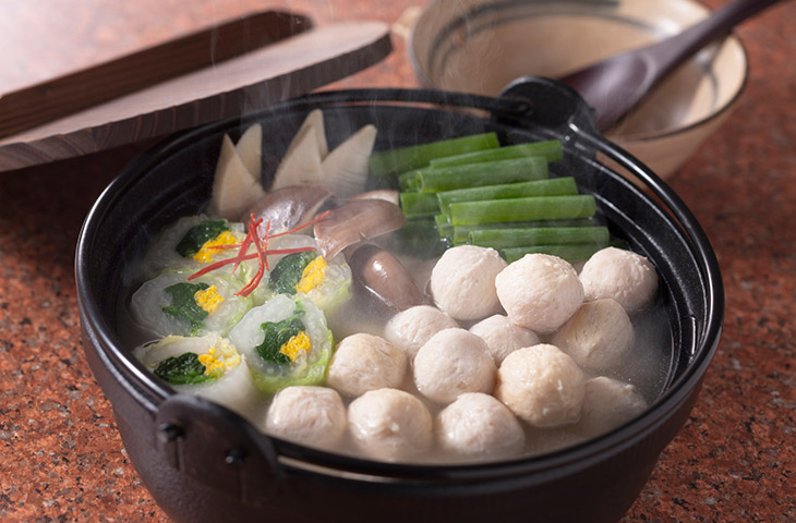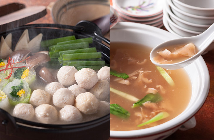 上質な国産鶏肉に、フカヒレの糸(繊維)をふんだんに混ぜ込んだ「ふかひれボール」。フカヒレのぷりぷり感が楽しめる程よい食感で、いろいろな料理の素材としても使えて便利。スープは鶏の旨みとフカヒレのコラーゲンが溶け込み、あっさりながらコクのある味わいです。