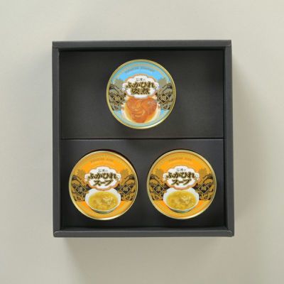 フカヒレの姿煮(1缶)とスープの缶詰(2缶)のセットです。スープは濃縮タイプなので薄めて海鮮や野菜などお好みの具材を入れるなど手軽にお楽しみいただけます。あんかけ丼やラーメン、茶わん蒸しなどアイデア次第で幅広く活用できる使い勝手の良さが人気です。