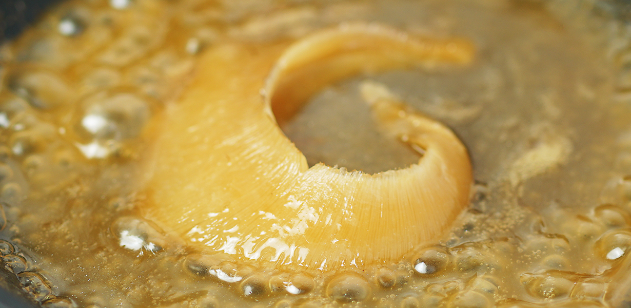 小型のヒレは姿煮にするのが難しいとされていますが、新鮮なヒレを熟練の職人が丁寧に下処理。型崩れなくコラーゲンを最大に留める当社独自の技術で、フカヒレの醍醐味を存分に味わえる手軽で食べやすい商品です。