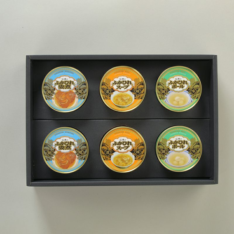 とろけような口当たりとコリコリ食感を楽しめる「ふかひれ姿煮」、鶏・豚、牛からじっくりと旨みを取り、厳選した調味料で味付けた「濃縮ふかひれスープ」、鶏肉にフカヒレ糸(繊維)をたっぷり混ぜ込んでボール状にし、鶏・豚ベースのすーぷでコトコト煮込んだ「ふかひれボール」の3種、2缶ずつのセットです。