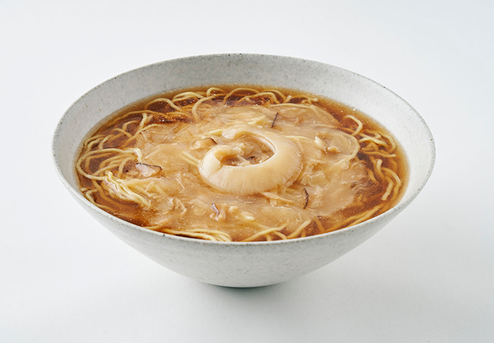 1枚すつ丁寧に加工した小ぶりのフカヒレ姿入りの特製あんかけ付き。とろりとのど越しの良い麺に絡み、山海の幸の旨みが広がる餡はクセになる美味しさです。こだわりの麺は指定製麺所で風味豊かに練り上げたちぢれ麺。本醸造濃口醤油ベースに豚、鶏、オイスターソースの旨みを加えたスープとの相性も抜群です。