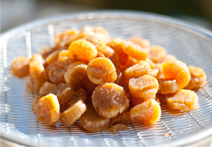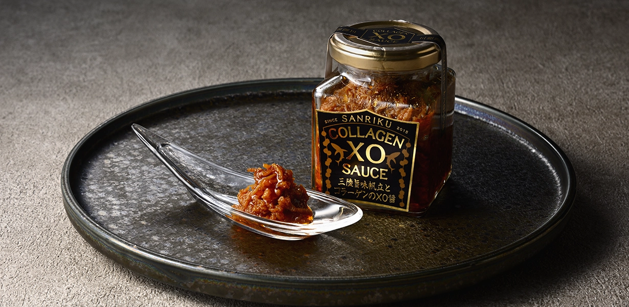 三陸産ホタテは旨み成分のグリコーゲンが多いため、乾燥させると旨みが凝縮され良質の干し貝柱に。でも形が崩れやすいのが難点でした。この良質な素材を活かそうと、ほぐした貝柱が主原料のXO醤を開発しました。