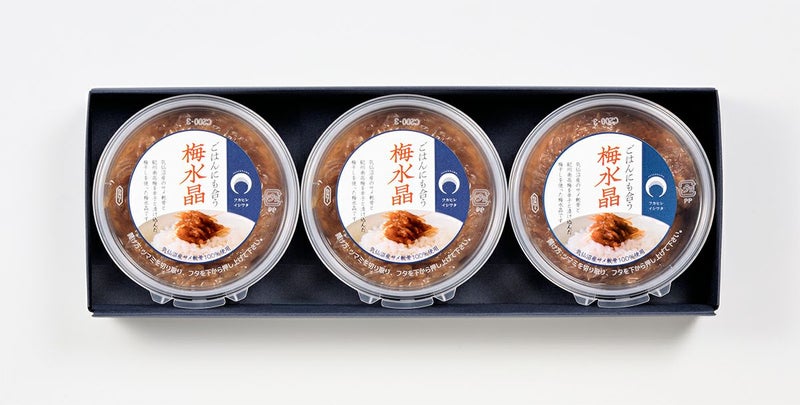 梅干本来の自然の味わいを残しながら調味液に唐辛子を加え、風味豊かに仕上げております。 ピリッとした快い辛さと旨さが調和した奥深いコクとまろやかな舌ざわりが特徴です。 箸休めやお酒のつまみにも合う梅水晶ですが、『ご飯にも合う梅水晶』を作り、もっと多くの人にこの味を味わって頂きたいと開発した商品です。