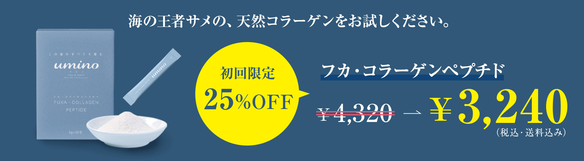 Uminoで使用しているものは、海洋性コラーゲンペプチドのなかでも王者と言われる、サメのフカコラーゲンペプチドです。動物性コラーゲンに比べて、7倍の吸収率を持っています。またBSEや鶏インフルエンザ、豚コレラなどの心配がなく、安心して使用していただけます。